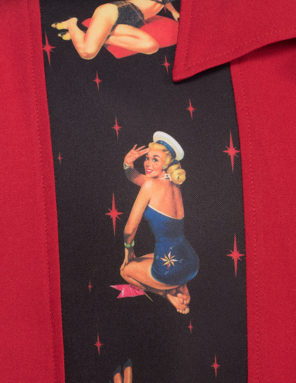 This double panel red bowling shirt features a stunning custom design of assorted pin up girls.