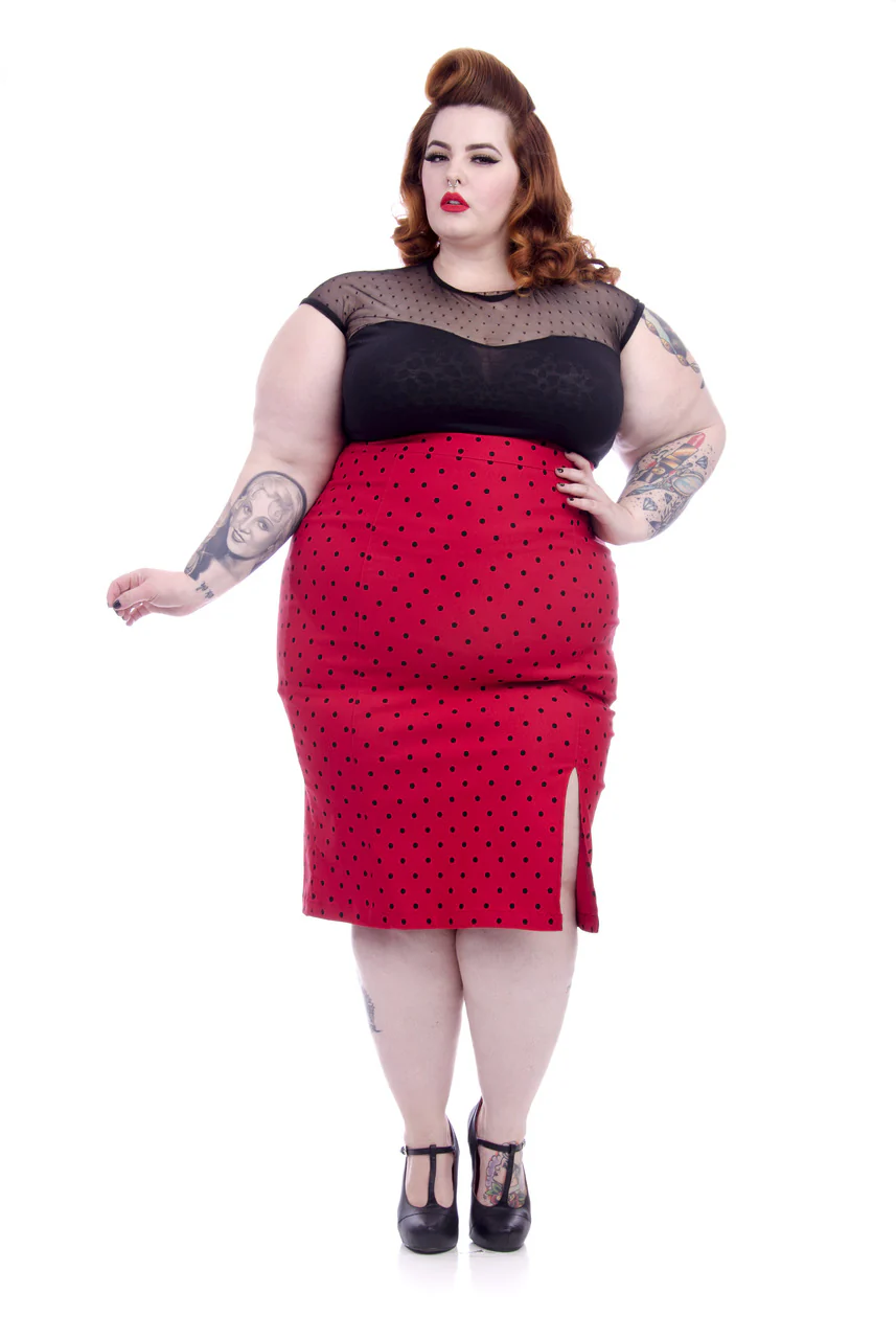 This eye catching red polka dot pencil skirt will not only have you stand out in a crowd, but is form fitting and perfect for your lovely curves. It's great for a casual day or a night out and super versatile! Available in red and mint. It is made from a mixture of Rayon, Nylon, and Spandex for stretch and comfort.